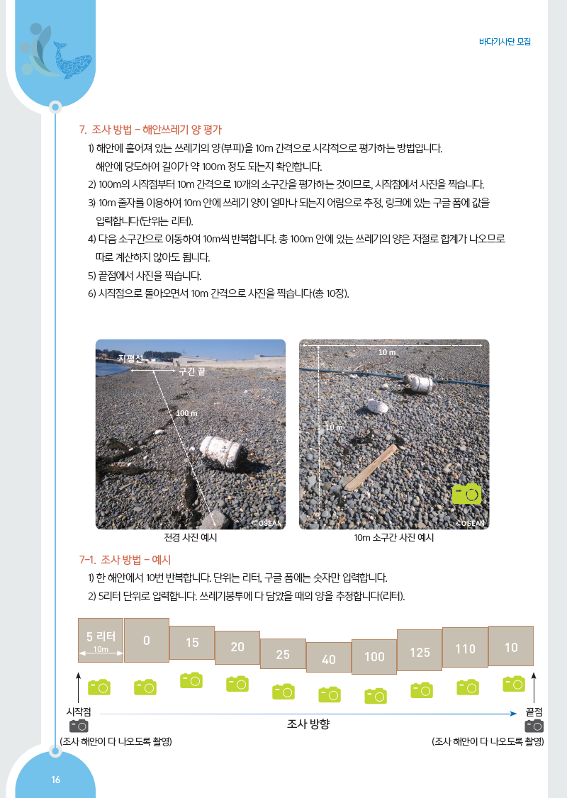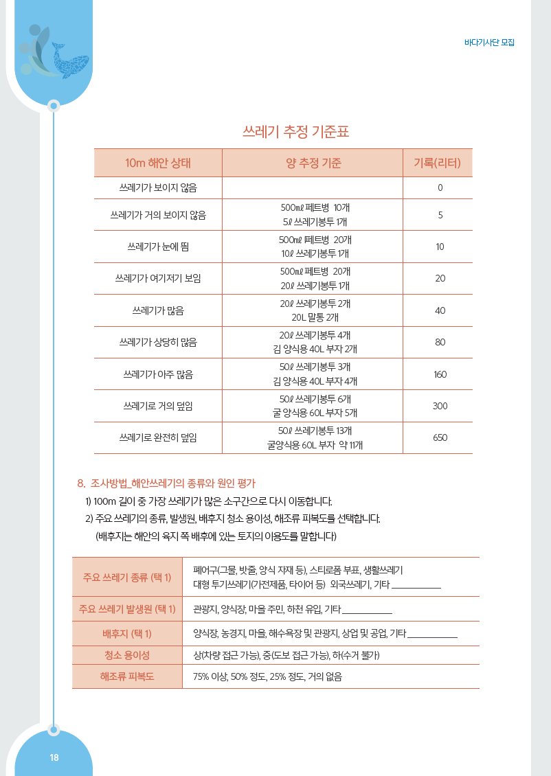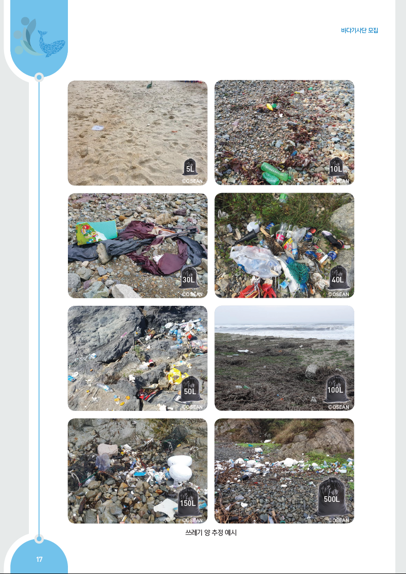 스마트폰으로 바닷가에 방치되어 있는 쓰레기를 촬영하고 부피를 추정하며, 주변의 중요한 발생원인과 주요 쓰레기를 보고합니다.